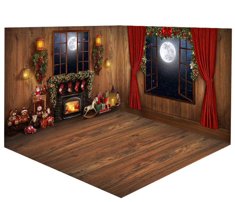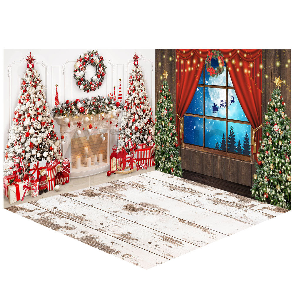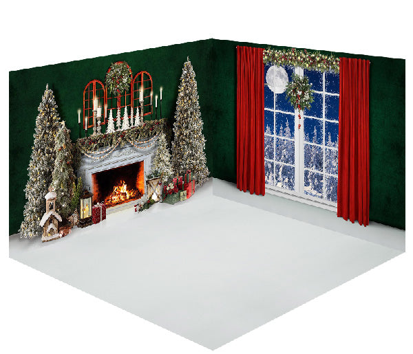 Avezano Winter Christmas Tree and Fireplace Photography Backdrop Room Set