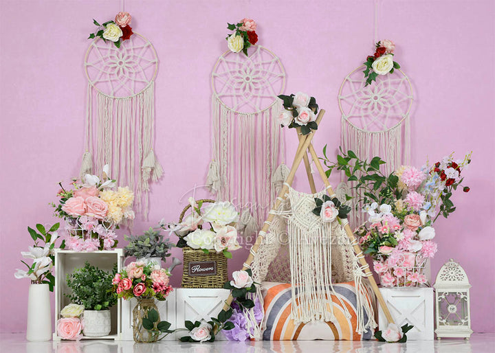 Avezano Pink Background Boho Flowers Backdrop For Photography
