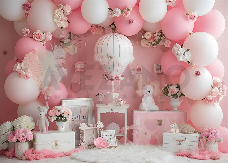 Avezano Pink Girl Flowers and Hot Air Balloons Birthday Party Photography Background