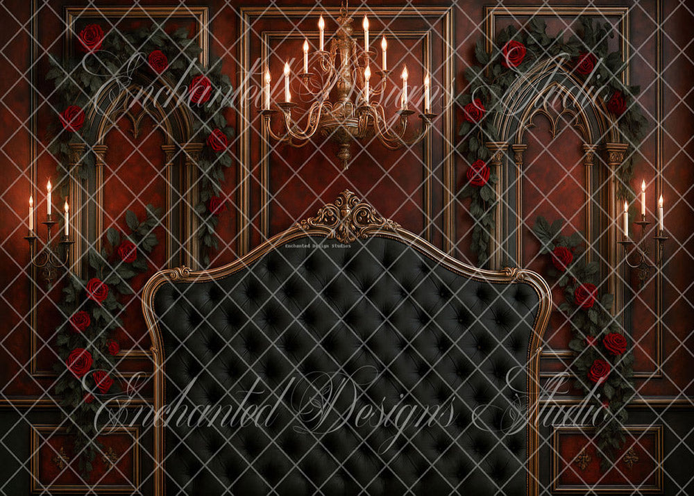 Avezano Black headboard and red roses Backdrop Designed By Enchanted Design Studio
