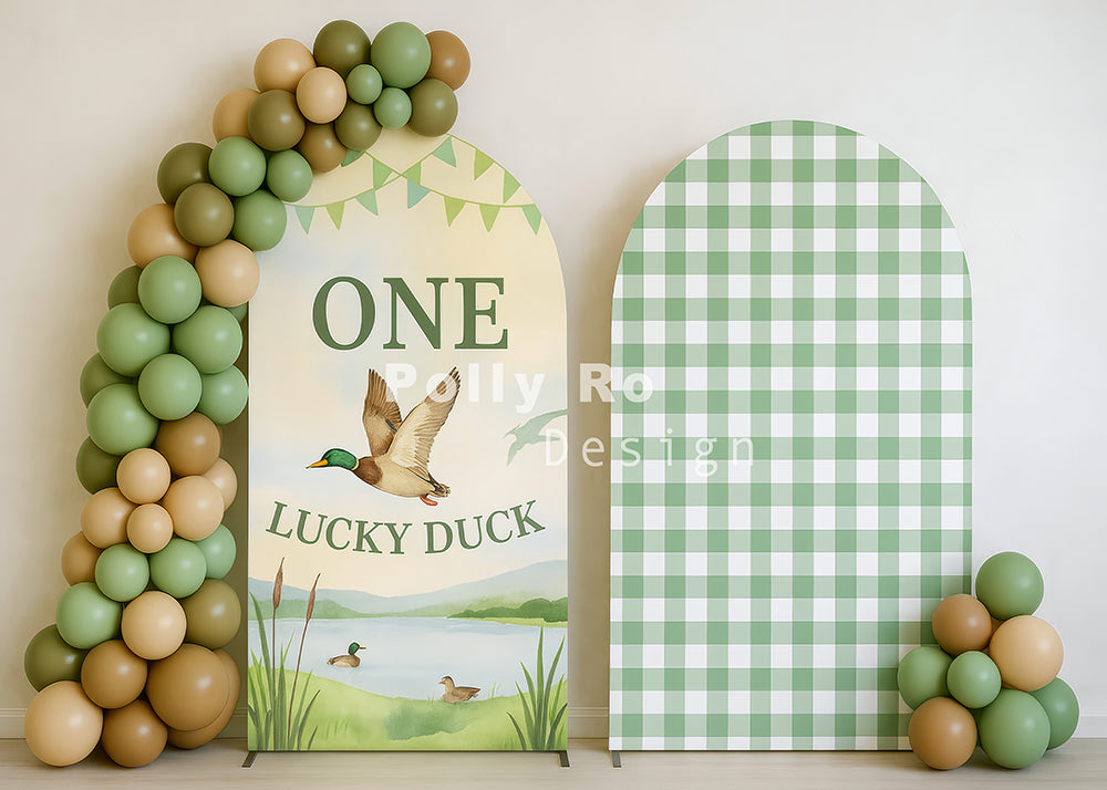 Avezano Green Balloon Arch and Lucky Duck Sign Photography Backdrop Designed By Polly Ro Design