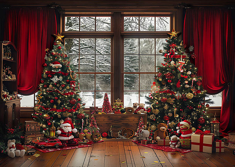 Avezano Red Curtains and a Christmas Tree Room Photography Backdrop