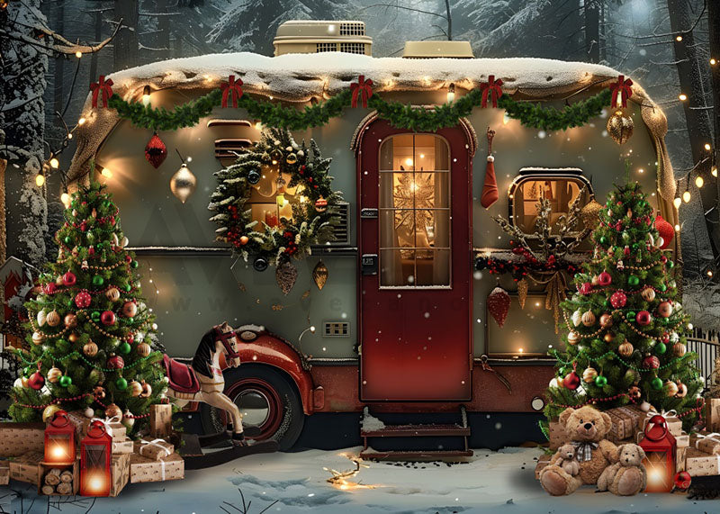Avezano Christmas Light green RV in the Snow Photography Backdrop