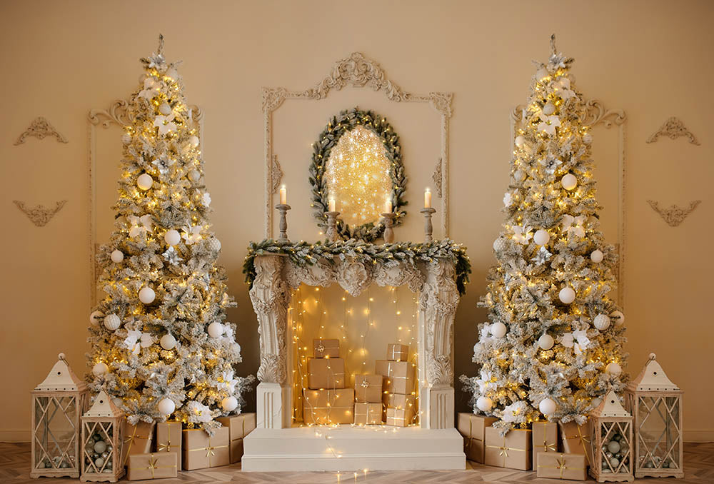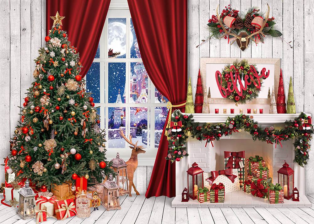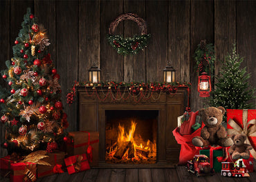 Avezano Winter Christmas Tree and Fireplace Photography Backdrop Room Set