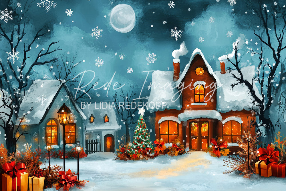 Avezano Snowy House and Moon Christmas Photography Backdrop Designed By Lidia Redekop