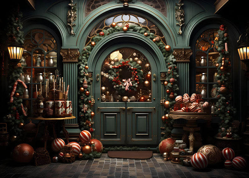 Avezano Green Doors and Windows Christmas Tree and Presents Photography Backdrop