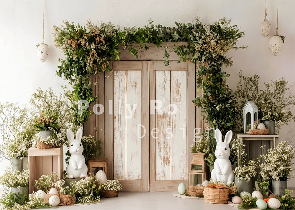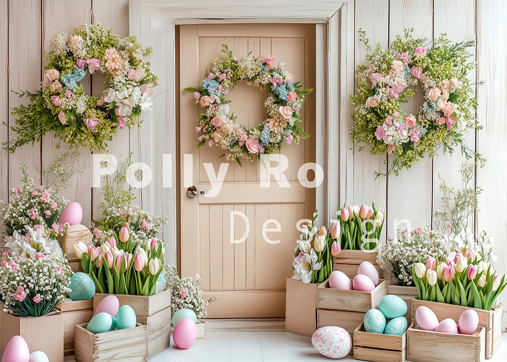 Avezano Wooden Doors and Potted Flowers in Spring Photography Backdrop Designed By Polly Ro Design