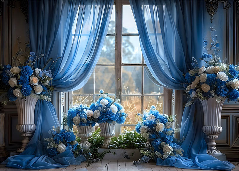Avezano Spring Blue Roses and Floor-to-Ceiling Windows Photography Backdrop