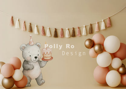 Avezano Birthday Bear with Cake and Tassels Photography Backdrop Designed By Polly Ro Design
