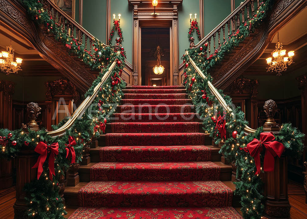 Avezano Christmas Red Decorative Art Stairs Photography Backdrop