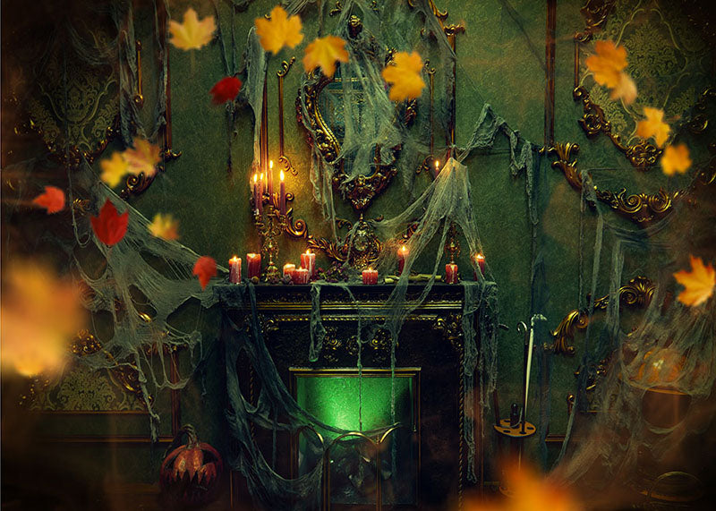 Avezano Fall Halloween Fireplace and Cobwebs 2 pcs Set Backdrop