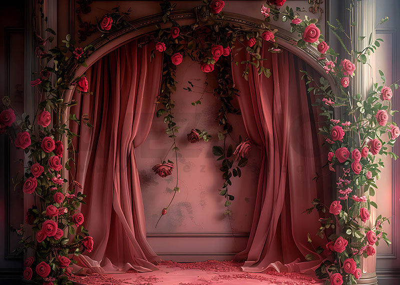 Toile de fond pour photographie de rideaux et de roses rouges de printemps d'Avezano