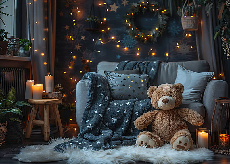 Fond de photographie d'anniversaire avec canapé et ours en peluche Avezano