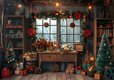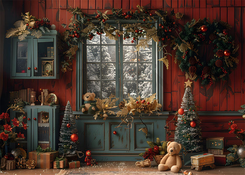 Toile de fond pour photographie de murs bleus et de fenêtres de Noël à Avezano par Lecheme Ruby Gu
