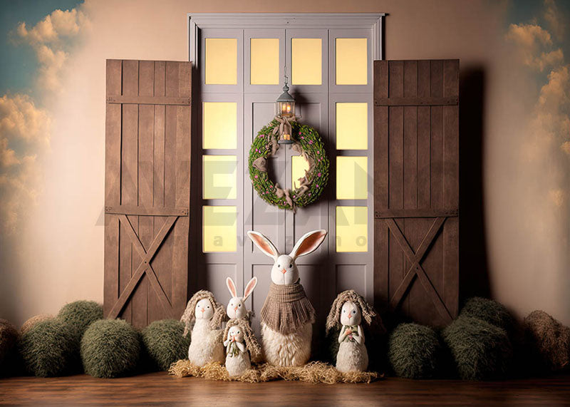 Toile de fond pour photographie de décoration de petite porte en bois bleu de Pâques d'Avezano conçue par Polly Ro Design