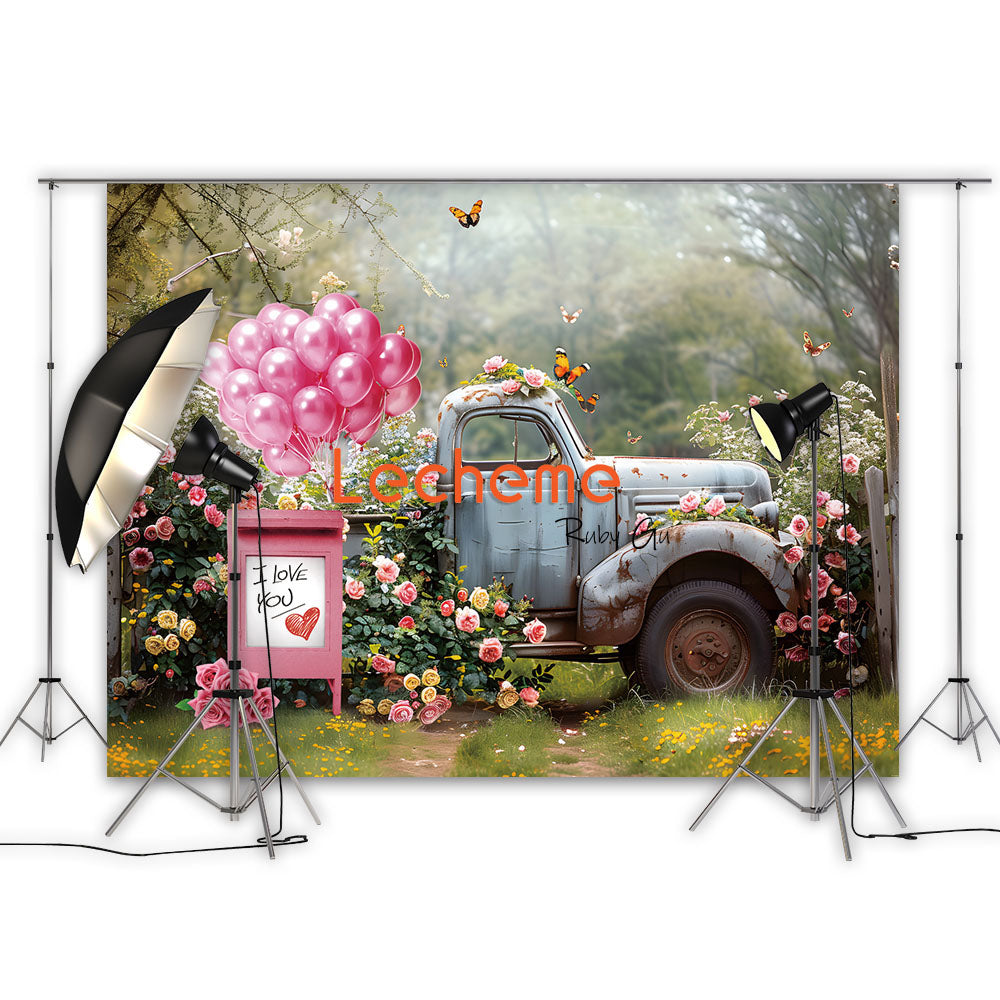 Toile de fond pour photographie de la Saint-Valentin, ballons roses et camions, Avezano, par Lecheme Ruby Gu