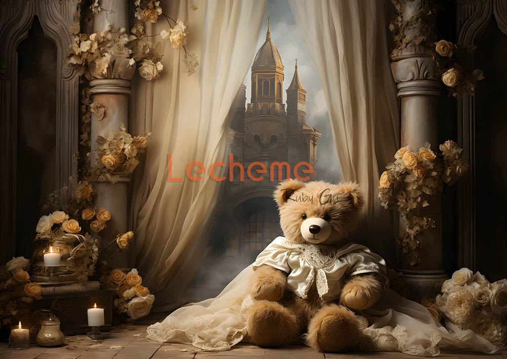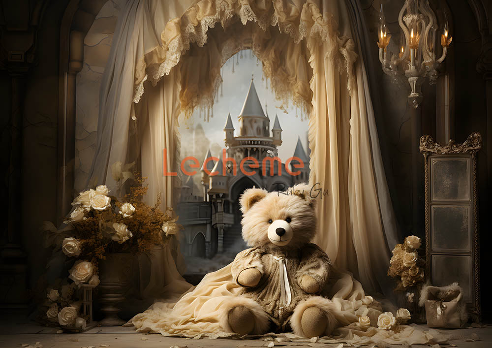 Toile de fond pour photographie de château vintage et de jouets d'ours d'Avezano par Lecheme Ruby Gu