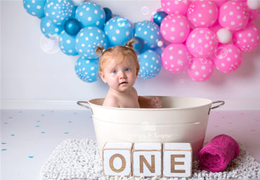 Toile de fond pour la photographie de ballons bleus d'Avezano pour une fête d'un an par Paula Easton