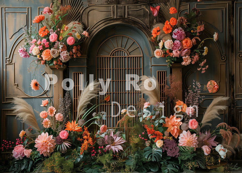 Portes en bois d'Avezano et fleurs en pot dans un arrière-plan photographique printanier conçu par Polly Ro Design