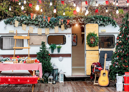 Toile de fond pour photographie de scène extérieure de camping-car décoré de Noël à Avezano
