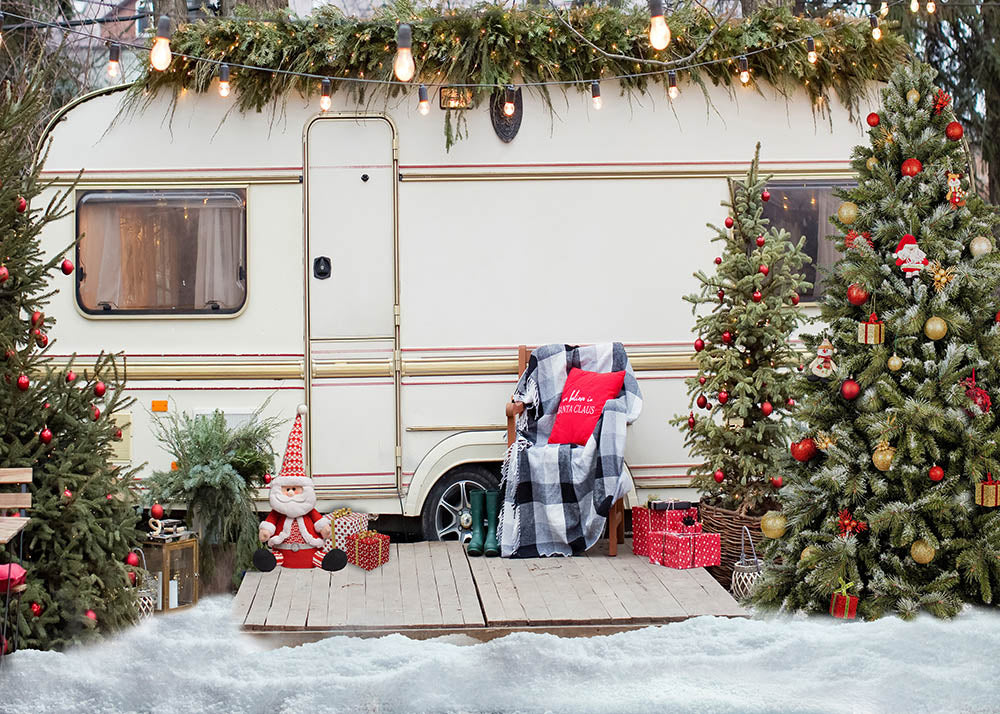 Arbres de Noël d'Avezano Gui décoré RV Scène extérieure Photographie Toile de fond