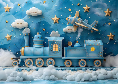 Fond de photographie d'anniversaire de modèles d'avions et de trains de ciel bleu d'Avezano