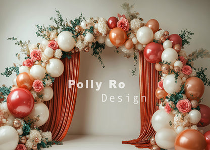 Toile de fond pour photographie d'anniversaire avec des fleurs et des arches de ballons de style bohème d'Avezano, conçue par Polly Ro Design