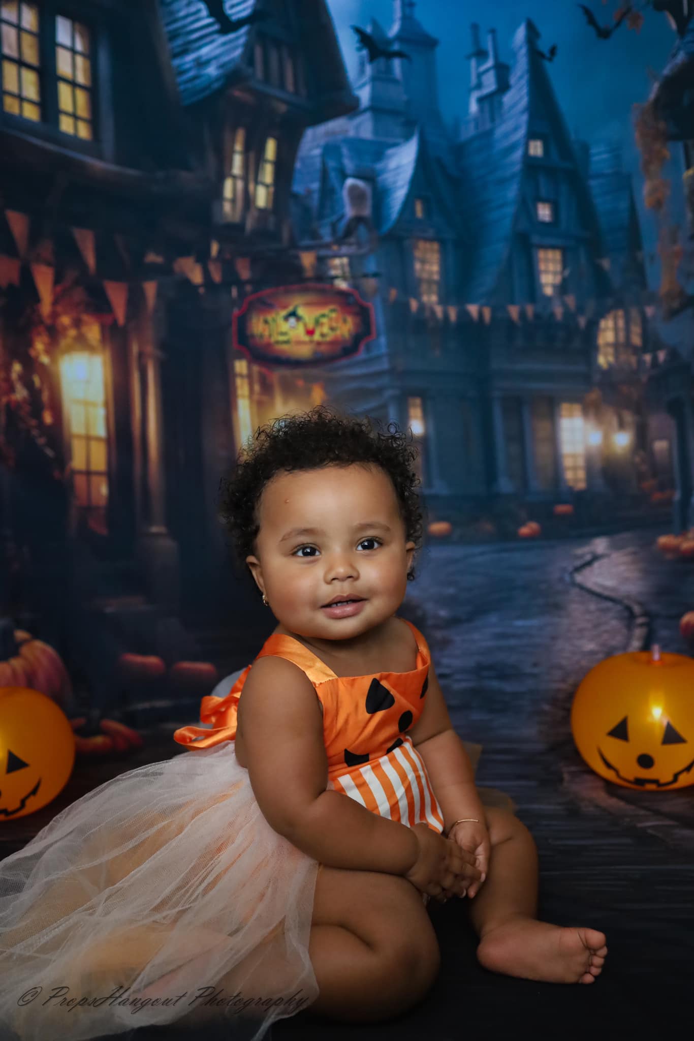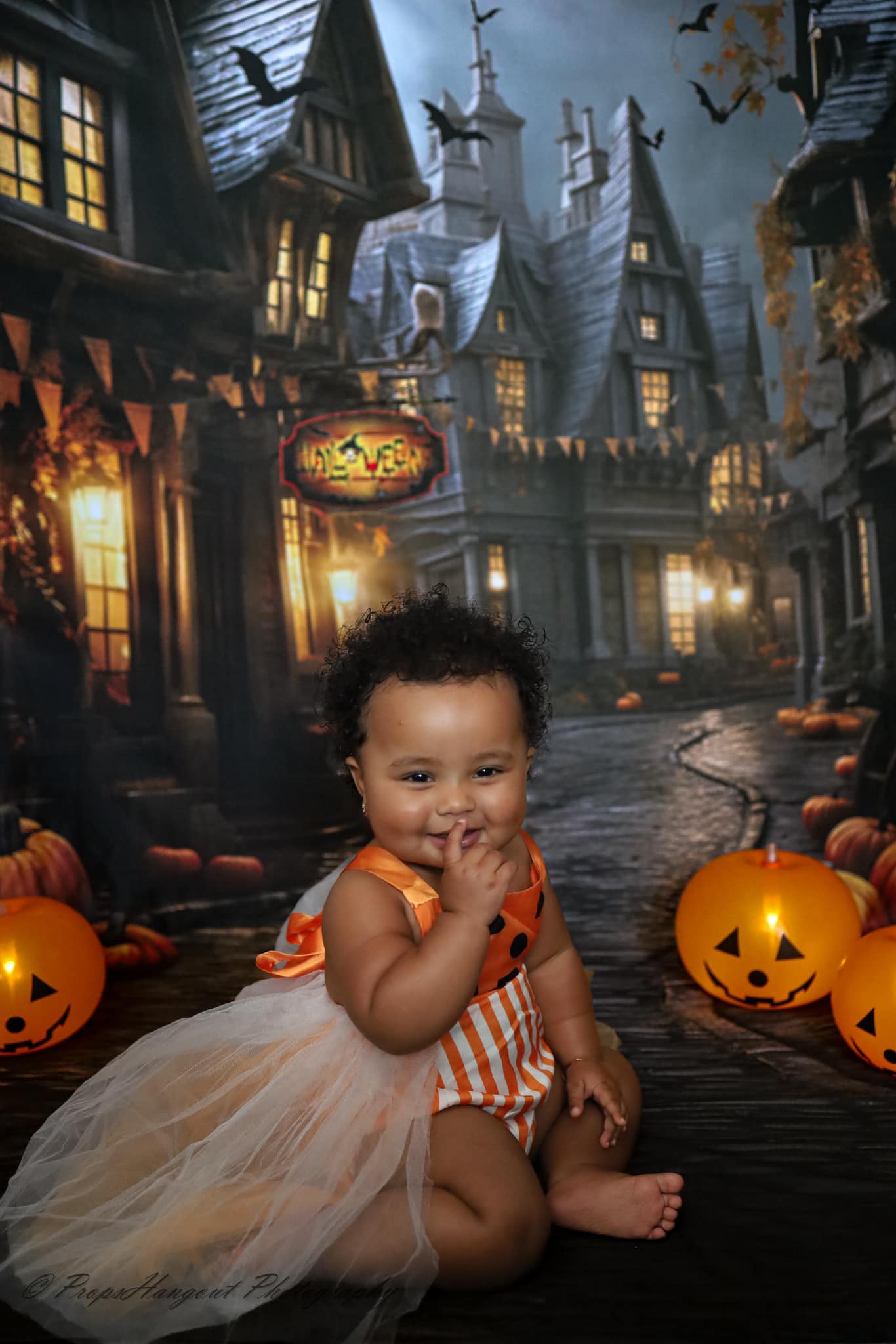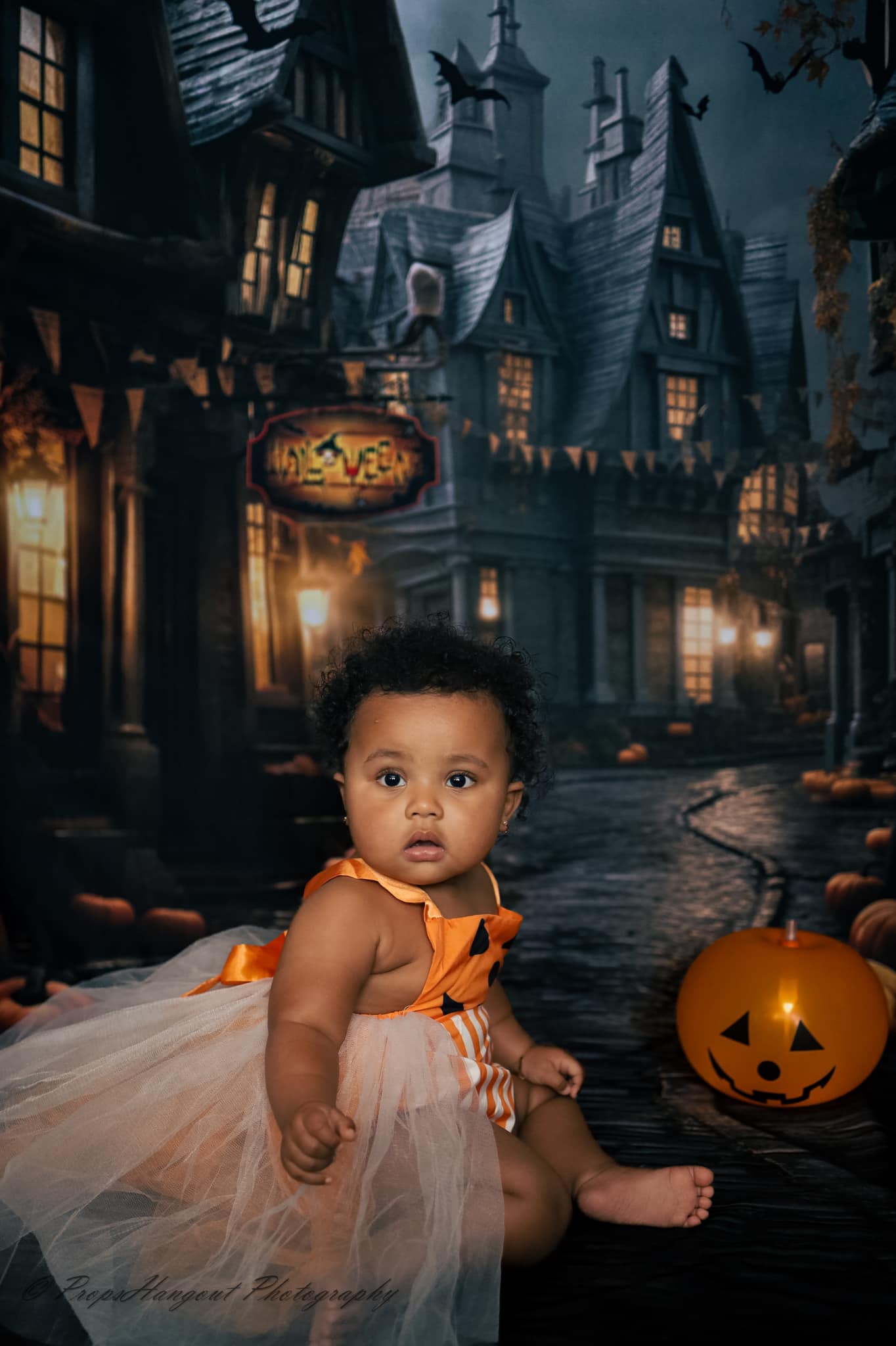 Toile de fond pour photographie de la rue d'Avezano à Halloween la nuit
