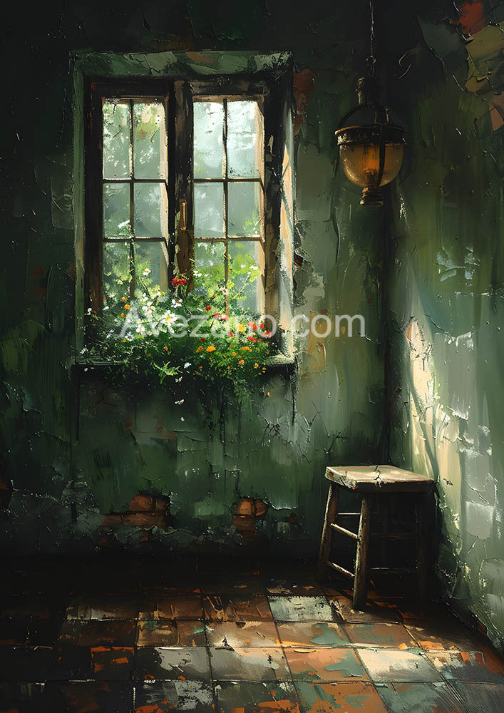 Toile de fond pour photographie de rebord de fenêtre d'intérieur et de fleurs de style peinture à l'huile d'Avezano