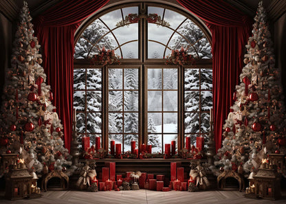 Toile de fond pour photographie de sapin de Noël rouge et de cadeaux d'Avezano
