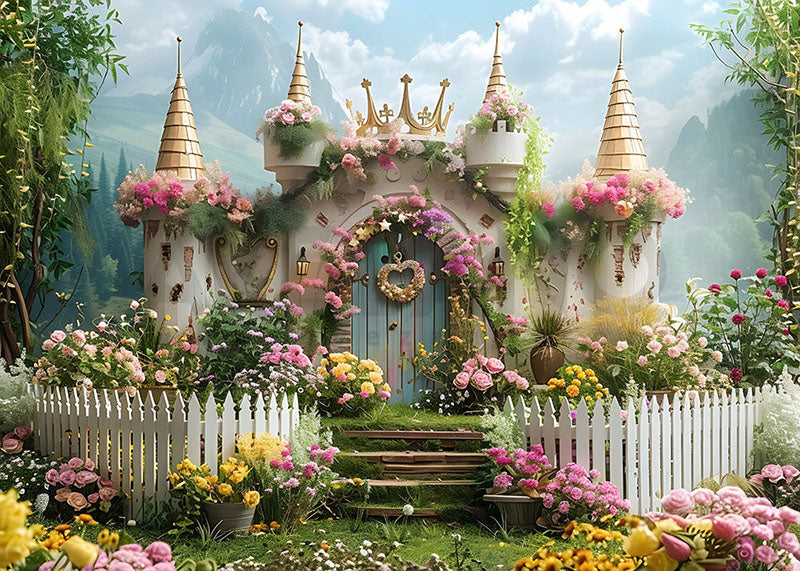 Toile de fond pour photographie de clôtures et de fleurs du château de la Couronne de printemps d'Avezano
