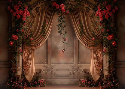 Toile de fond pour photographie de printemps avec roses rouges et mur d'Avezano