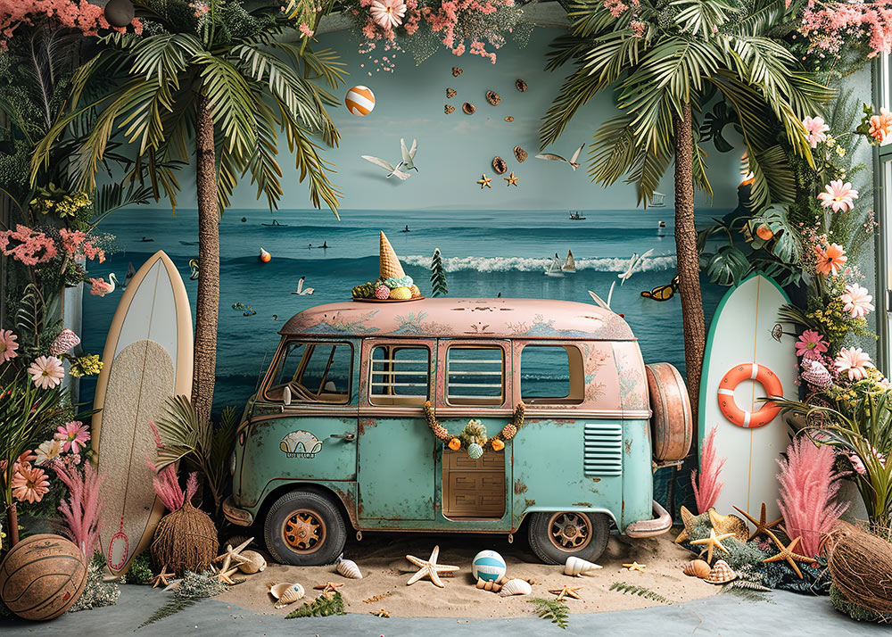 Toile de fond pour photographie de voiture rétro au bord de mer d'été d'Avezano