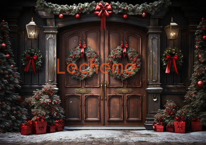 Toile de fond pour photographie de portes en bois rouges vintage d'Avezano et de cadeaux de Noël par Lecheme Ruby Gu