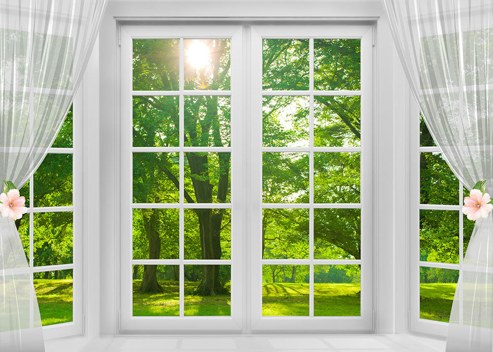 Fenêtres blanches du sol au plafond et bois d'Avezano en toile de fond pour une photographie printanière