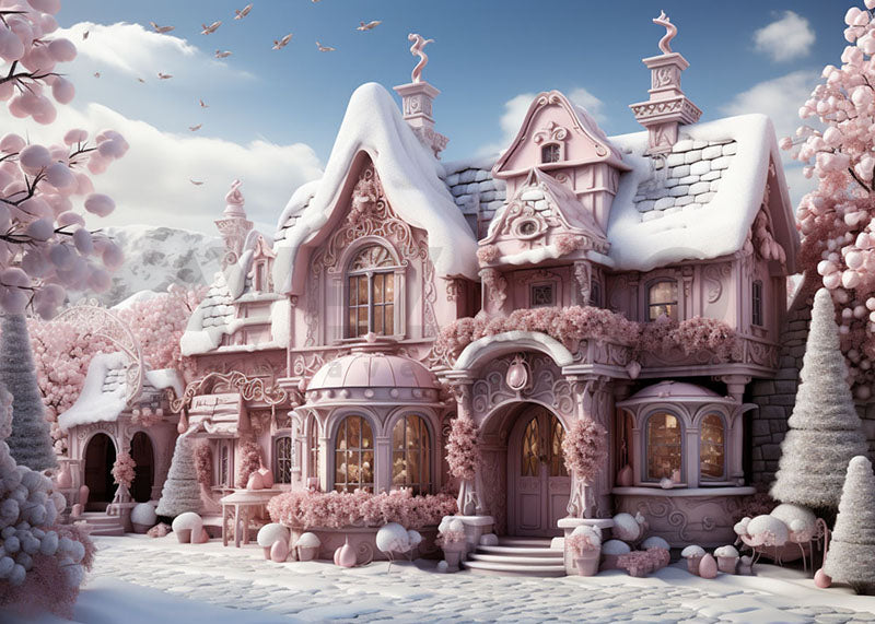 Toile de fond de photographie de la maison d'hiver de Noël rose d'Avezano