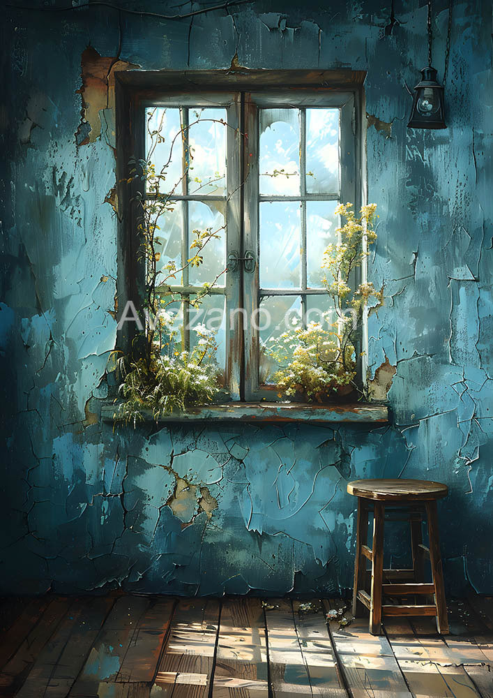 Toile de fond pour photographie de murs et de fenêtres bleus minables d'Avezano