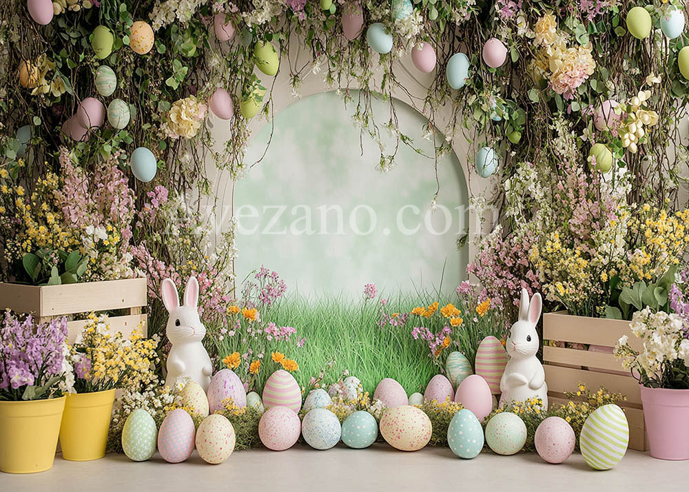 Toile de fond pour photographie de lapin et d'œufs de Pâques arc-en-ciel d'Avezano conçue par Polly Ro Design