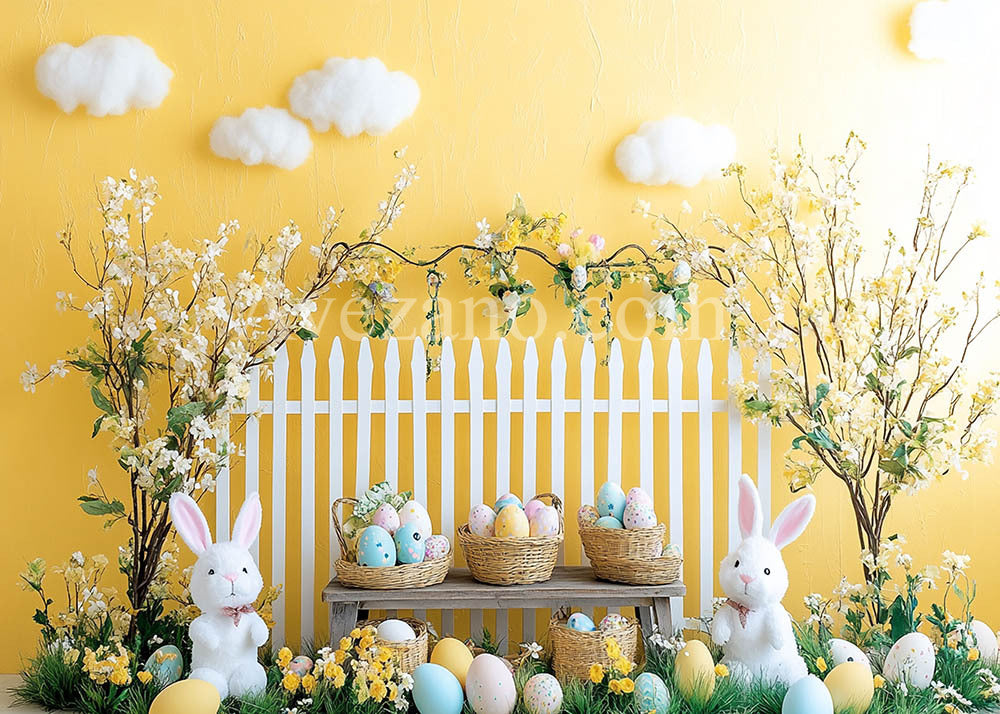 Toile de fond pour photographie de printemps de Pâques avec murs jaunes et œufs de lapin à Avezano