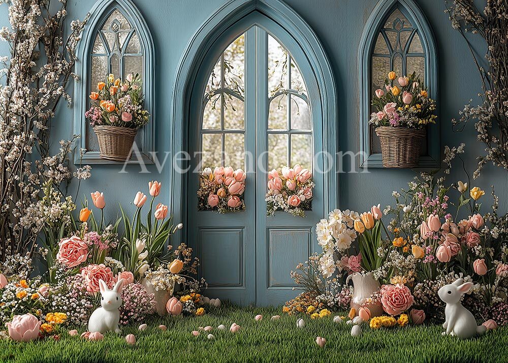 Toile de fond pour photographie de printemps de Pâques avec des fleurs et une porte bleue d'Avezano