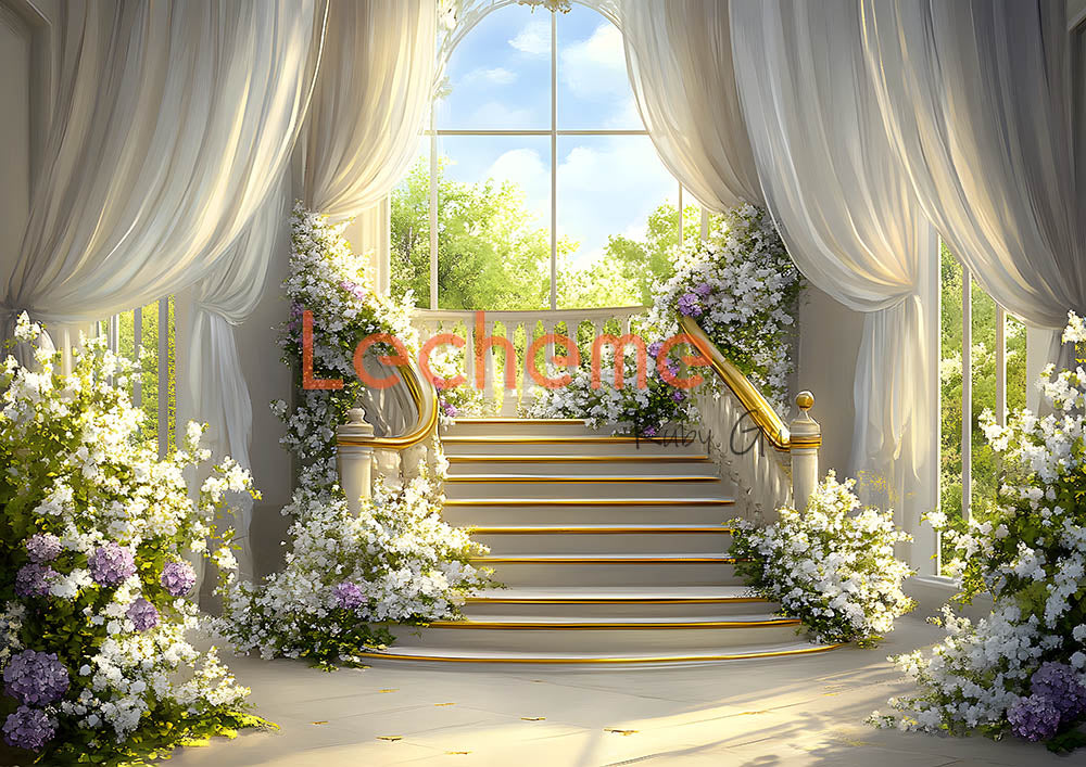 Toile de fond pour photographie de jardin avec escalier doré d'Avezano par Lecheme Ruby Gu