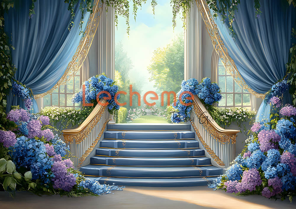 Toile de fond pour photographie de fleurs bleues et d'escaliers d'Avezano par Lecheme Ruby Gu