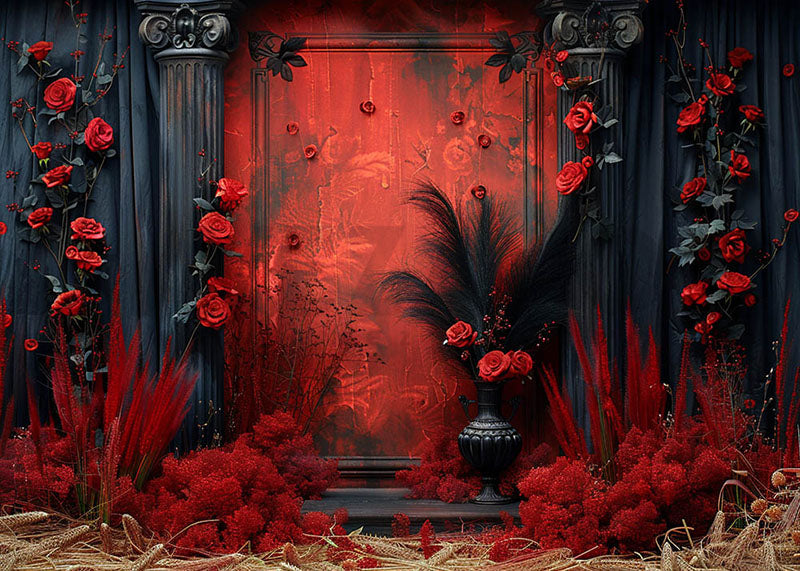 Toile de fond pour photographie de roses rouges et de rideaux noirs de style bohème d'Avezano