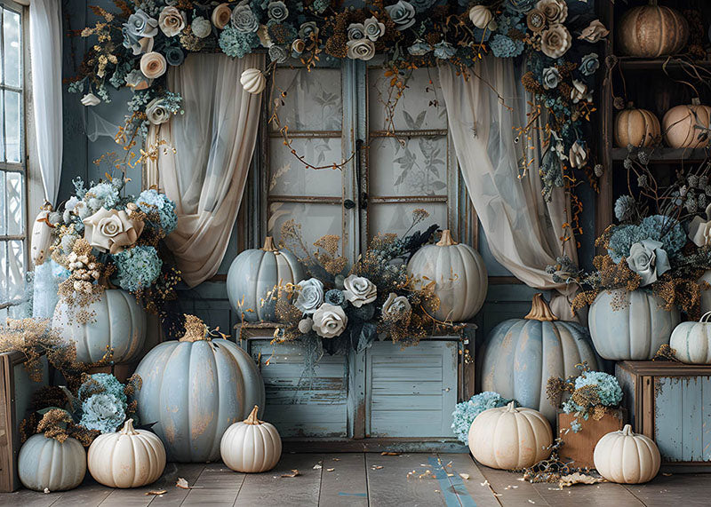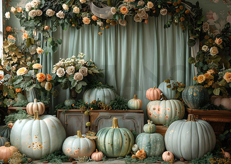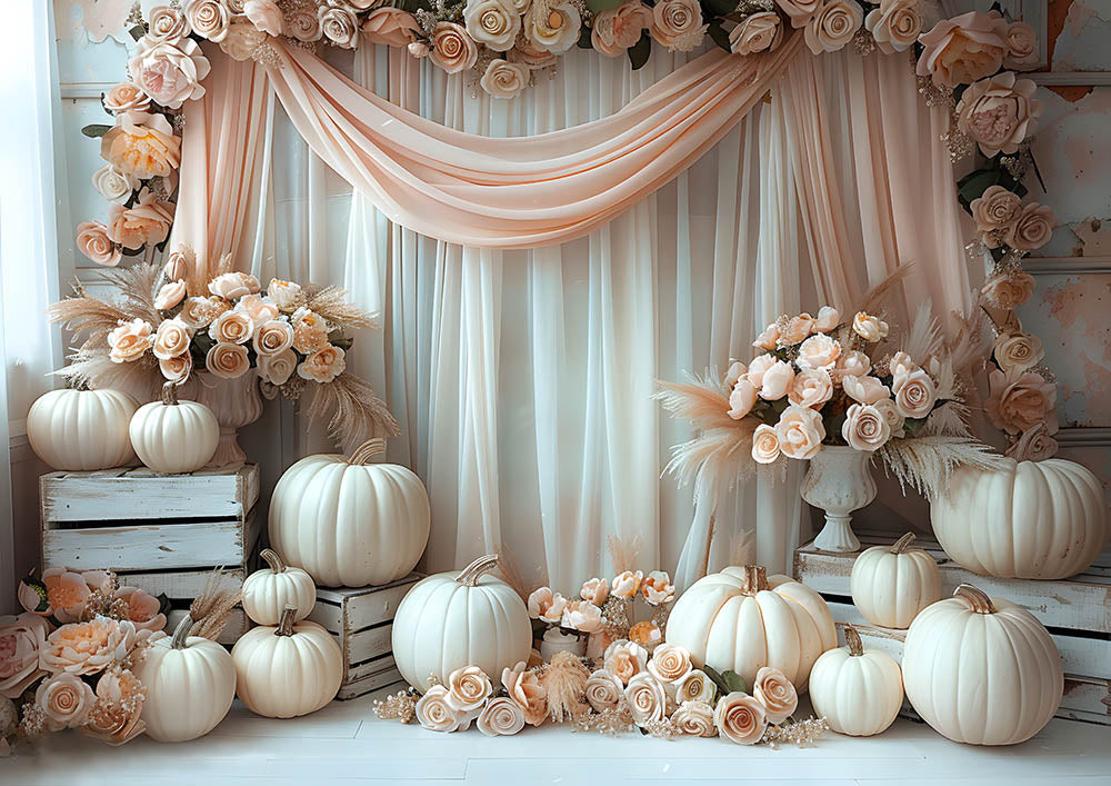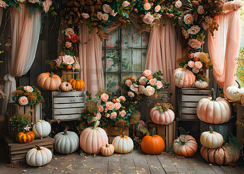 Toile de fond pour photographie de citrouilles et de fleurs roses d'Avezano
