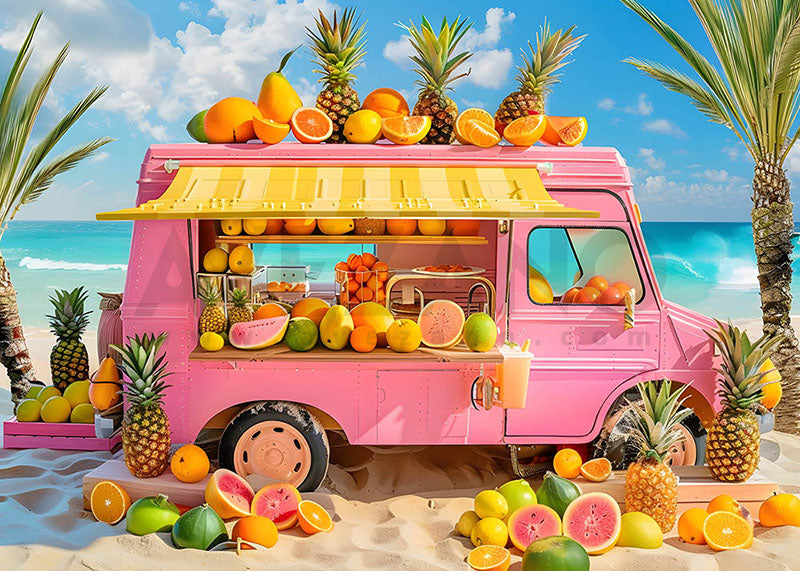 Toile de fond pour photographie d'un magasin de jus de fruits d'été sur la plage d'Avezano