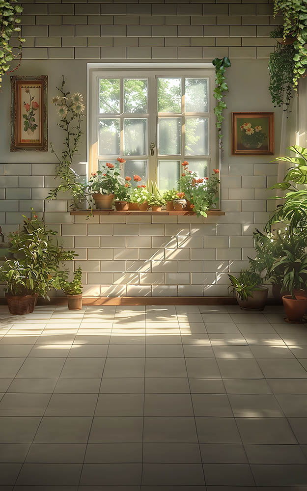Les fenêtres ensoleillées et les plantes vertes du printemps d'Avezano balayent la toile de fond de la photographie