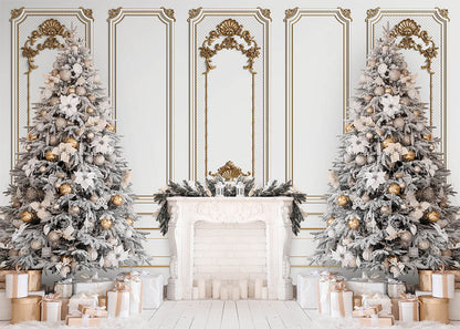 Avezano Élégant Mur Blanc Arbres De Noël Cheminée Photographie Toile De Fond