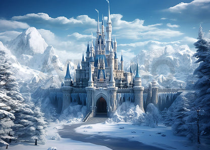 Photographie du château bleu d'Avezano dans la neige en hiver
