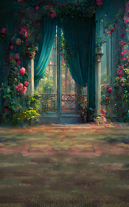 Rideau de fleurs d'Avezano - Toile de fond de fenêtre bleue pour la photographie
