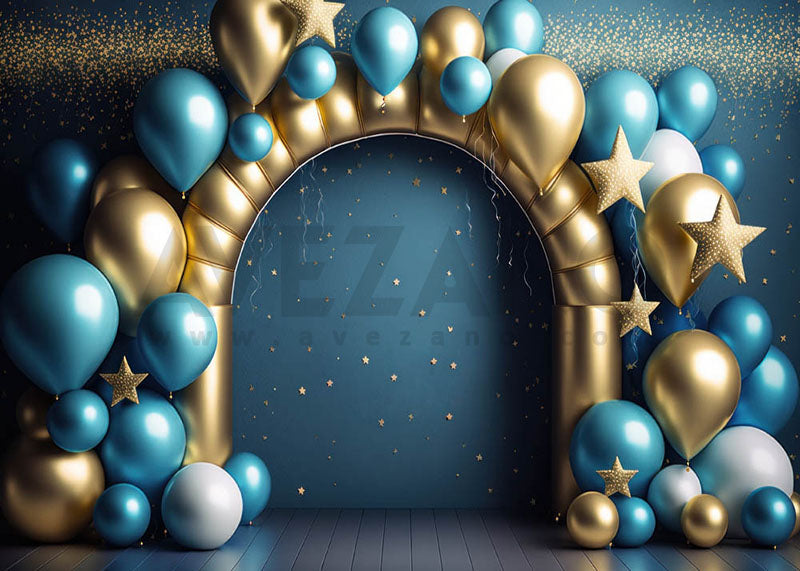 Fond de photographie d'anniversaire de fête de ballons dorés et bleus d'Avezano